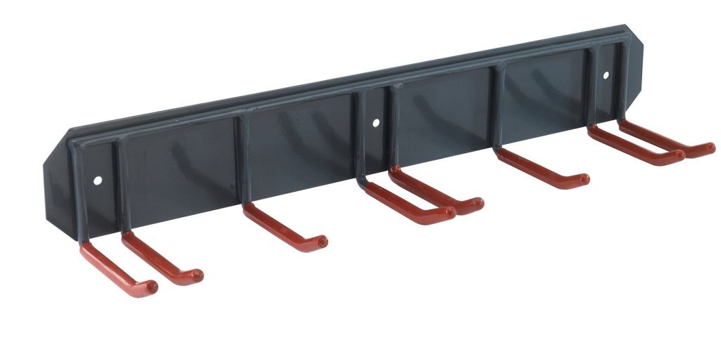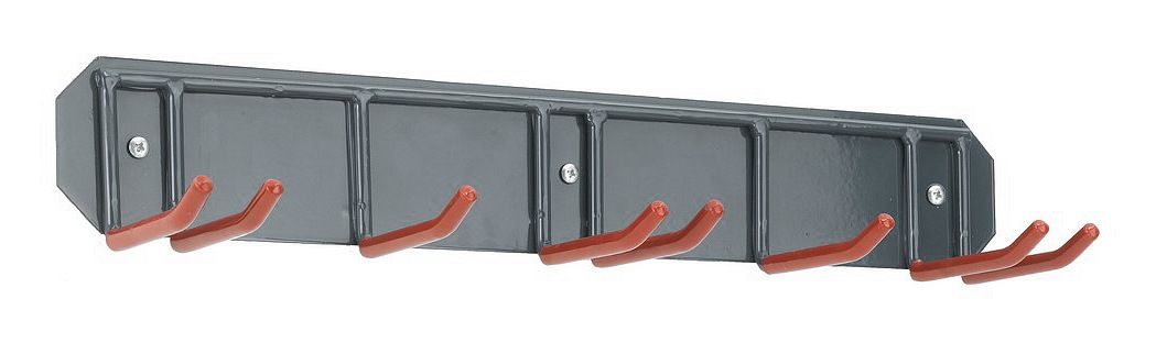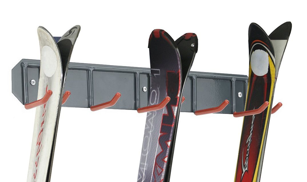 Praktyczny uchwyt na narty i kijki z mocowaniem do ściany. Uchwyt jest w całości metalowy i składa się z solidnej podstawy oraz zestawu haczyków.