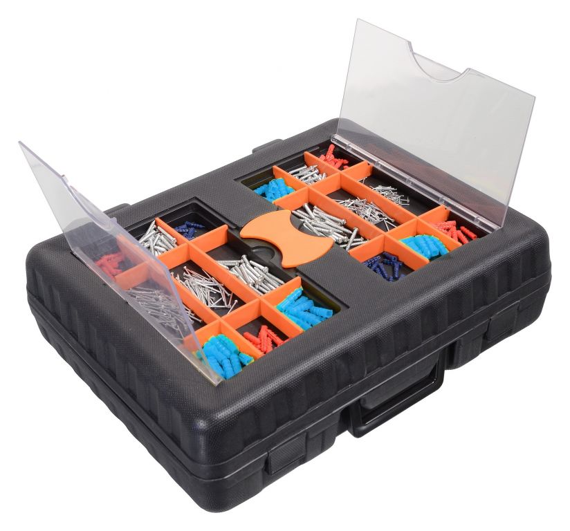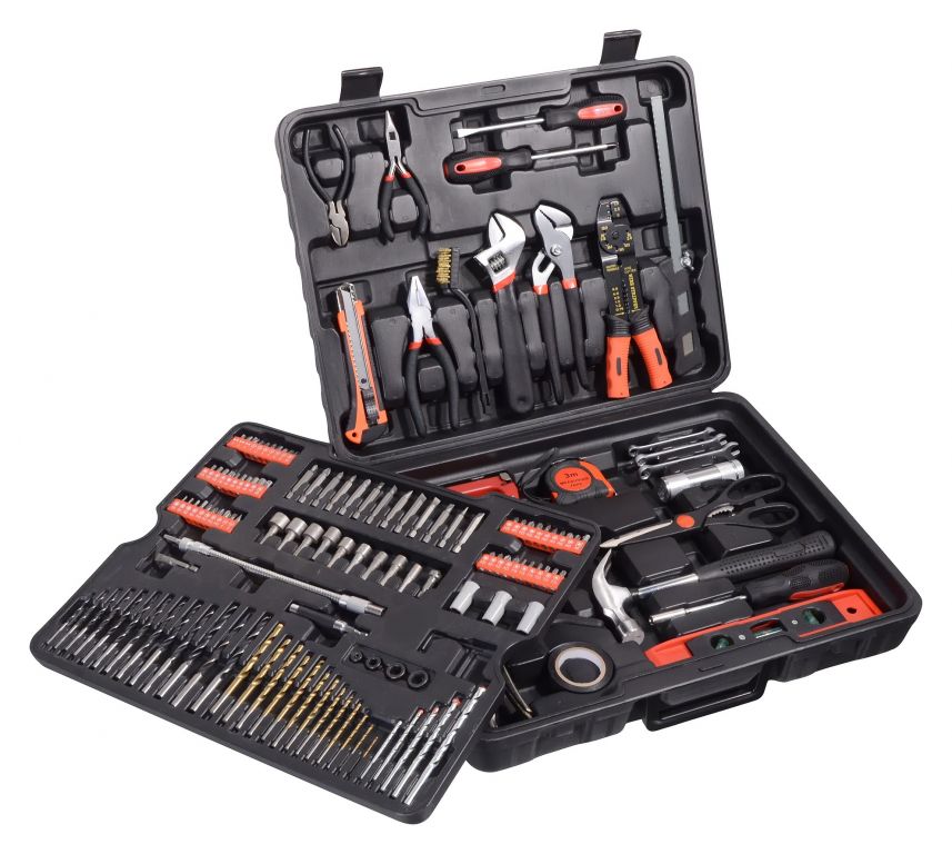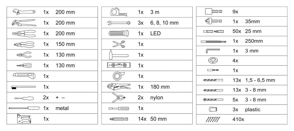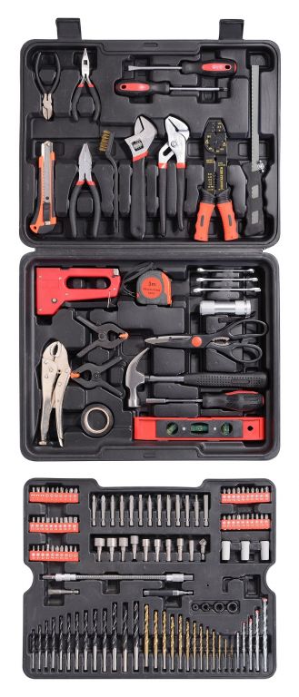 Wszystko jest ułożone w przejrzystych pozycjach, plus jedna taca z narzędziami w środku. Zestaw zawiera szeroką gamę wierteł, bitów, kluczy nasadowych, wkrętaków, szczypiec, młotka, poziomnicy, kluczy bocznych, podstawowych elementów złącznych i wielu innych narzędzi, które nadają się do użytku w domu, w garażu i na drodze.