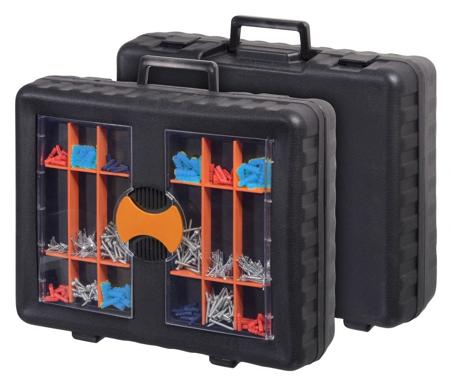 Praktyczny futerał z wysokiej jakości narzędziami i zapięciami. Zapięcia znajdują się w pokrywie walizki.