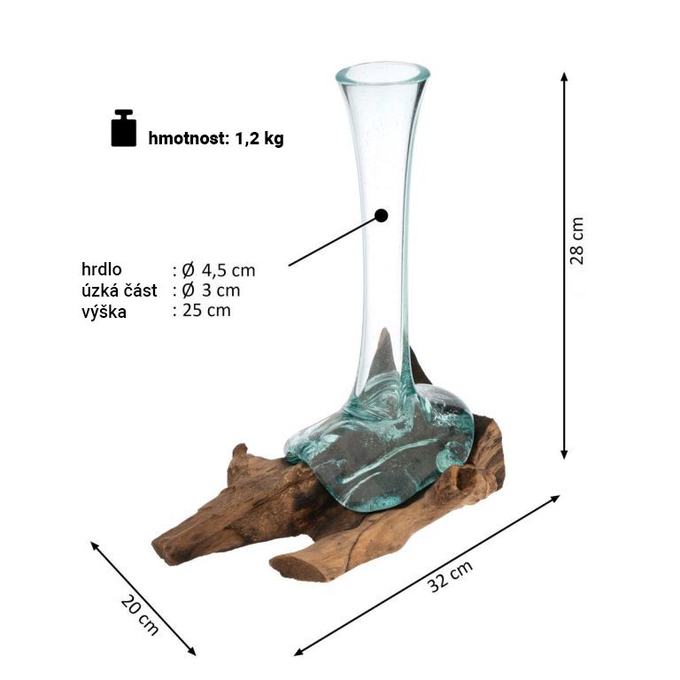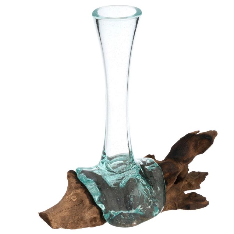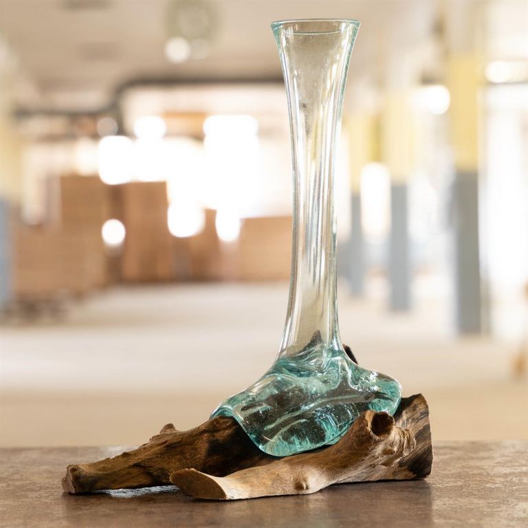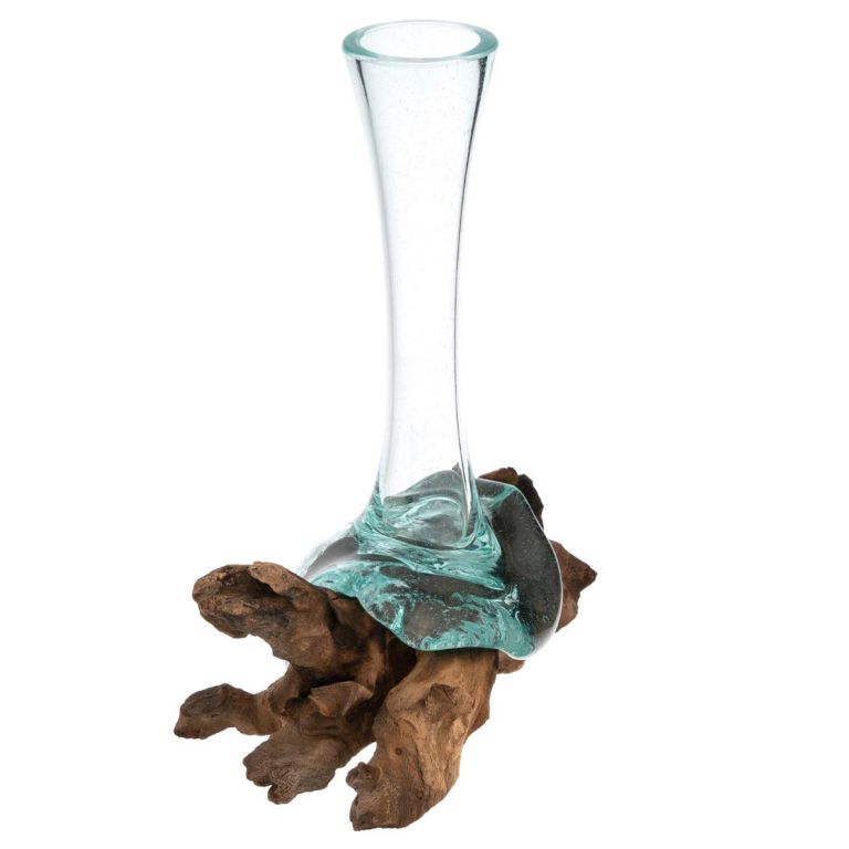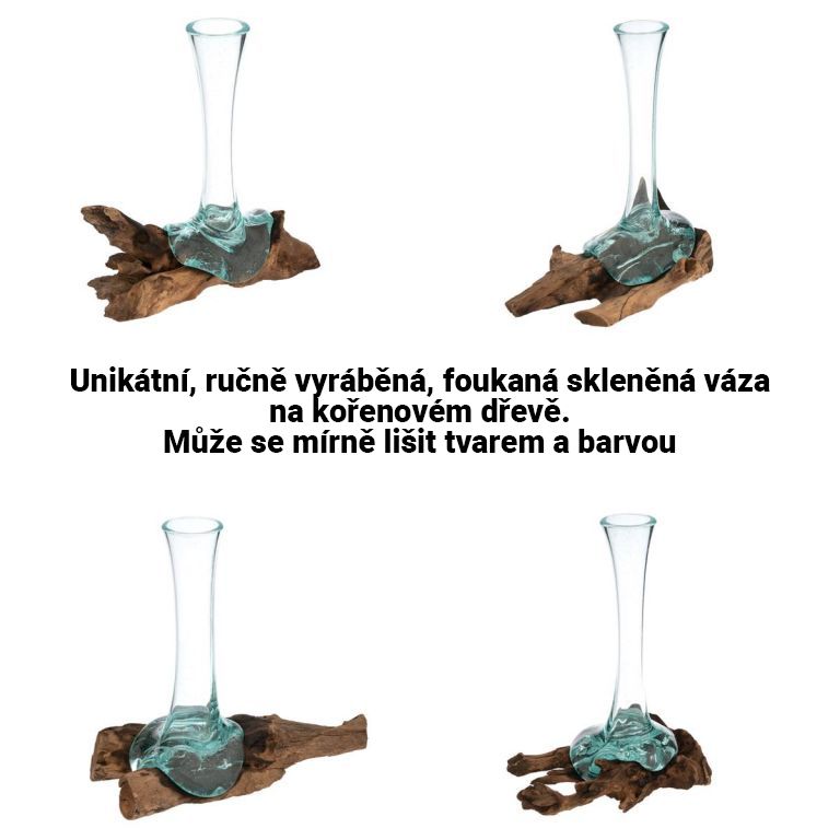 Te ręcznie robione szklane wazony na atrakcyjnym drewnie tekowym sprawią, że każdy dom będzie jeszcze piękniejszy. Użyj swojej wyobraźni i kreatywności i udekoruj wazon według swoich pomysłów. Ta dekoracja świetnie sprawdzi się również jako prezent dla przyjaciół i rodziny. Brak produkcji przemysłowej - podczas produkcji na drewno nakładane jest gorące szkło, które nadaje mu kształt zgodnie z jego kształtem. To tworzy niepowtarzalne produkty, żadne dwa wazony nie są takie same. Ponieważ jest to produkt czysto naturalny, mogą wystąpić drobne pęknięcia, nieznaczne różnice kolorystyczne lub drobne dziury, co nie wpływa na jakość produktu, ale podkreśla jego wyjątkowość. To samo dotyczy wszelkich drobnych wtrąceń powietrza lub cząstek, które mogą powstawać podczas pracy ręcznej.