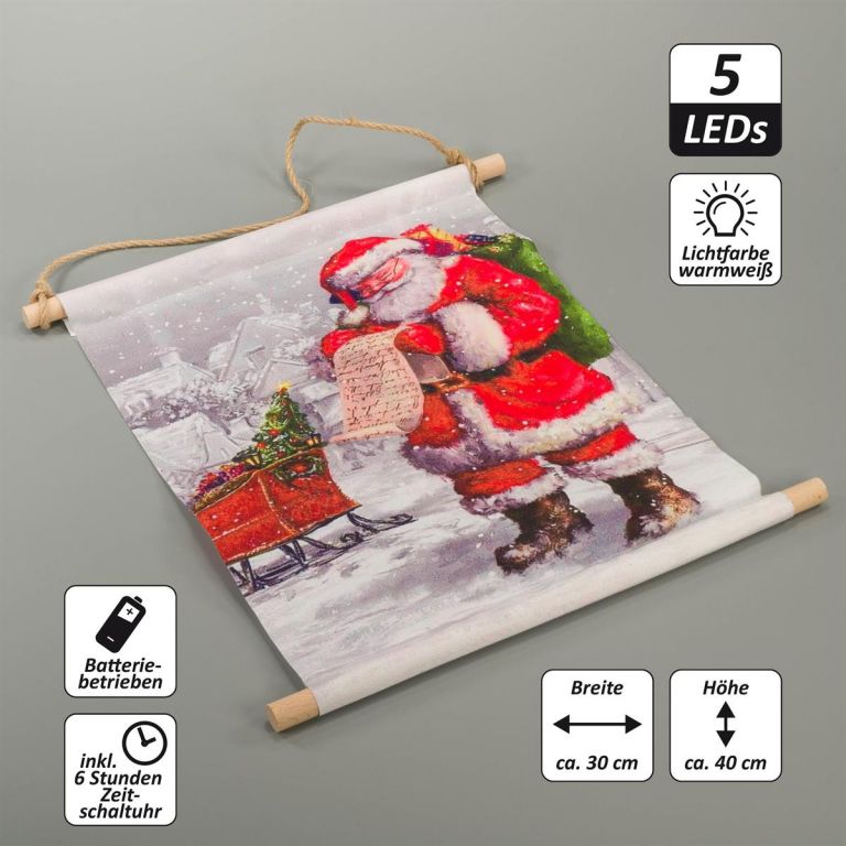 Fototapety są dostępne w różnych rozmiarach i motywach. Nowoczesne i wysokiej jakości płótna są zawsze ozdobą domu i nie tylko rozjaśnią otoczenie. Motyw Świętego Mikołaja z 5 ciepłymi białymi diodami LED wyczaruje przyjemną atmosferę i przytulny nastrój w Twojej przestrzeni życiowej. Zwłaszcza w okresie Bożego Narodzenia, ale oczywiście także o każdej innej porze roku. Zasilanie bateryjne pozwala na indywidualne zawieszenie fototapety, ponieważ nie musisz martwić się o irytujący kabel. Produkt można przymocować w dowolnym miejscu.