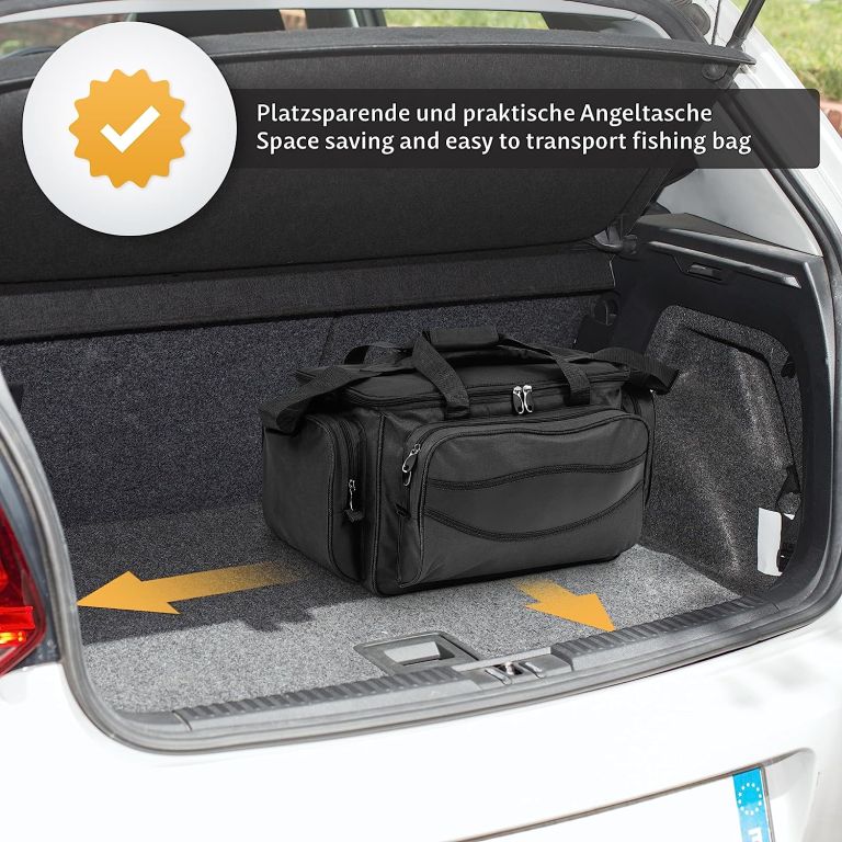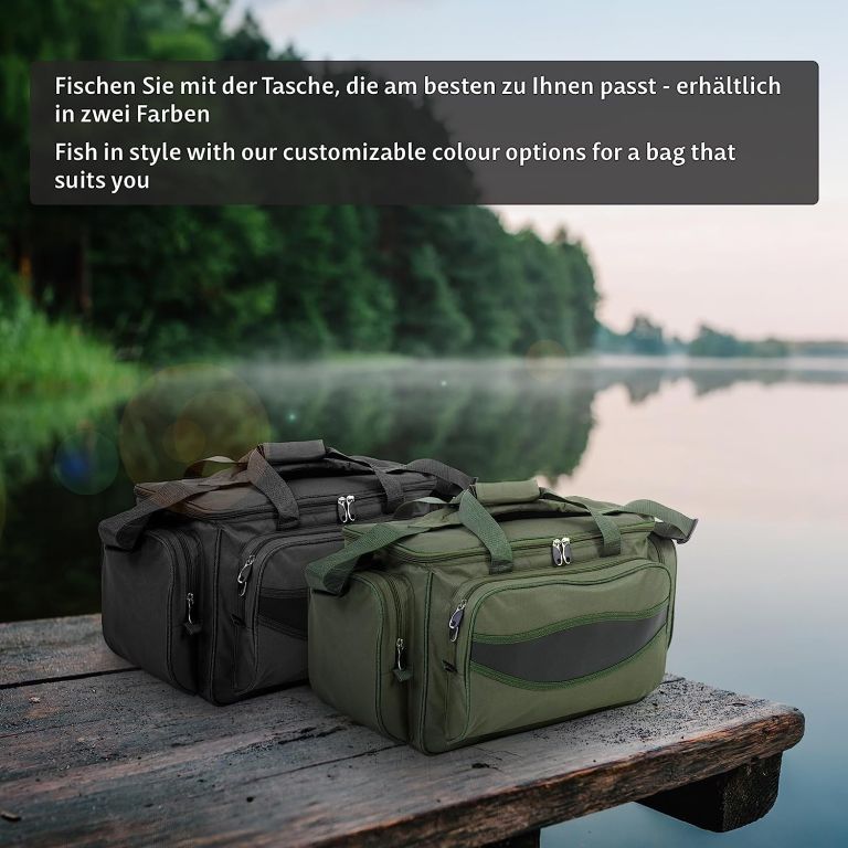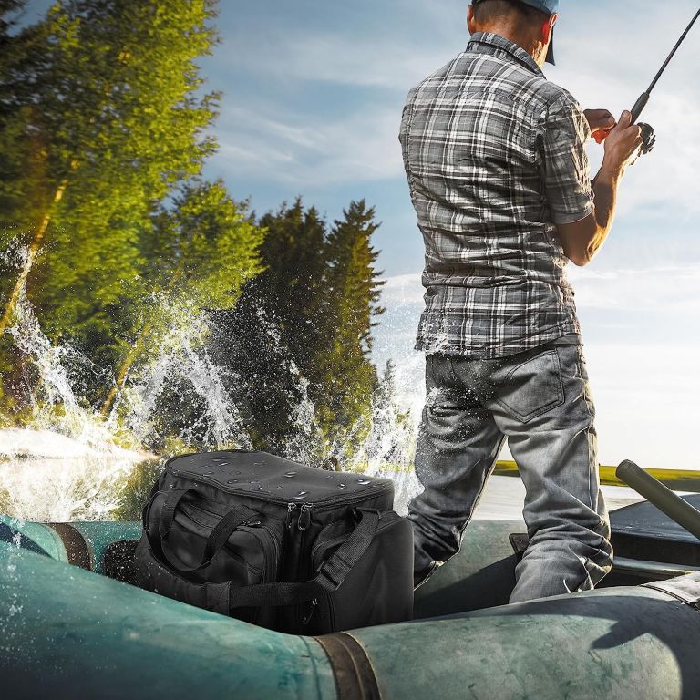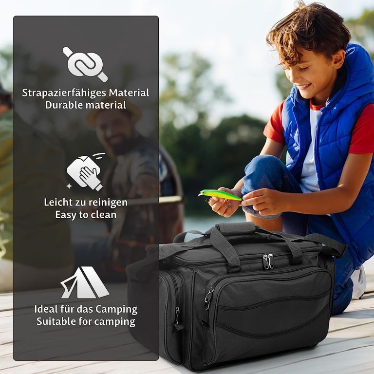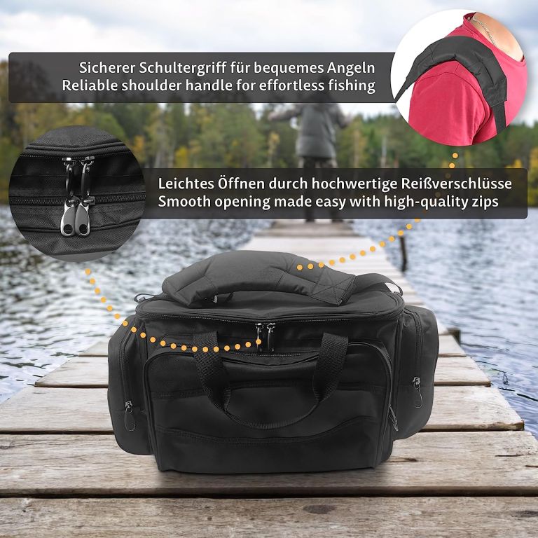Torba w czarnym kolorze z praktycznym podziałem i wygodnym noszeniem – świetna dla wędkarzy i miłośników outdooru.
