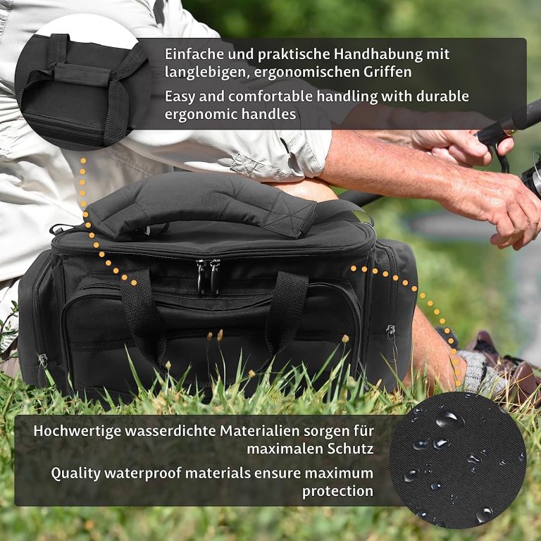 Wytrzymały materiał odpycha wodę i chroni zawartość nawet w niesprzyjających warunkach pogodowych. Wygodne noszenie zapewnia miękko wyściełany pasek na ramię oraz podwójna rączka na rzep. Czarna kolorystyka nadaje torbie elegancki i jednocześnie dyskretny wygląd – nadaje się zarówno na wyprawy w plener, jak i zorganizowane wyprawy wędkarskie.