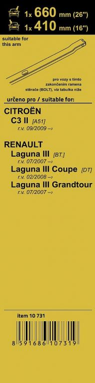 Zestaw dwóch płaskich wycieraczek typu Flat (kierowca + pasażer) ze specjalną nasadką. Zafunduj sobie dostawę tych wysokiej jakości wycieraczek. Długości wycieraczek i system mocowania wieszaków są dostosowane do tych wybranych samochodów - Citroën C3 II [A51] 09.09, Renault Laguna III [BT.] 07.07, Renault Laguna III Coupe [DT.] 02.08, Renault Laguna III Grandtour [KT.] 07.07 -