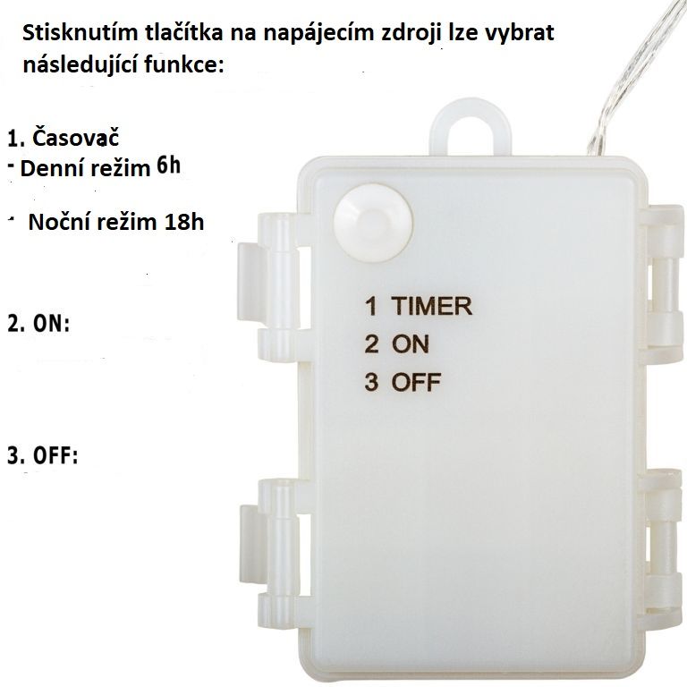 W łańcuchu bożonarodzeniowym znajduje się również minutnik - światła włączają się i wyłączają automatycznie przy pierwszym włączeniu. Będzie zawsze włączony przez 6 godzin i wyłaczony przez 18 godzin.