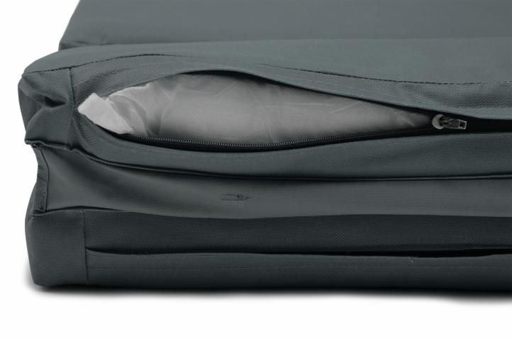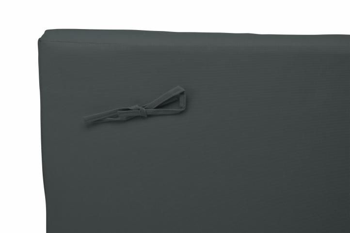 Wysokiej jakości, stylowe poduszki w antracytowym kolorze do ogrodu lub taras, łatwe do utrzymania. Powłoka wykonana jest z wytrzymałego, strukturalnego poliestru. Maty są również wyposażone w poduszkę na wysokości głowy. Dzięki ukrytemu zamkowi błyskawicznemu, można zdjąć poszewkę w każdej chwili i wyczyścić. Eleganckie poduszki są bardzo wygodne i zamienią krzesła i leżaki ogrodowe w eleganckie, wygodne i przytulne meble ogrodowe. Z tyłu mat znajdują się taśmy mocujące, którymi można przymocować matę na krzesło.