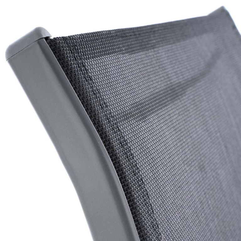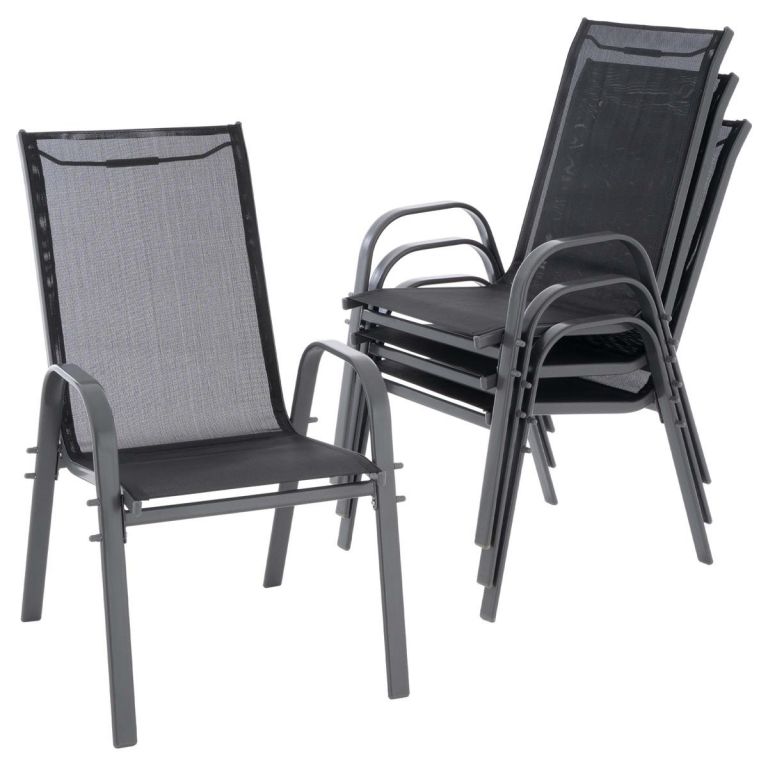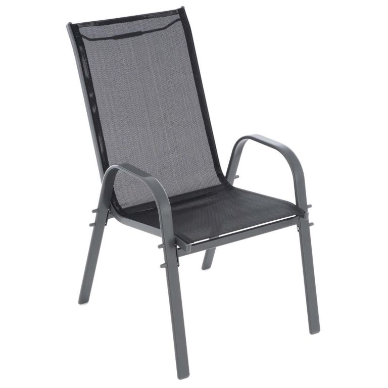 Siedzisko i oparcie krzesła wykonane są z czarnej elastycznej tkaniny. Krzesło na werandzie jest wyposażone w podłokietniki po prawej i lewej stronie do wygodnego siedzenia. Gdy nie są używane, kilka krzeseł można łatwo ustawić w stos, aby zaoszczędzić miejsce. Materiały zastosowane w tym krześle są bezobsługowe, odporne na warunki atmosferyczne i nie wymagają specjalnych środków pielęgnacyjnych. Niskie koszty wysyłki, ponieważ krzesło jest częściowo zdemontowane. Szczegółowa instrukcja montażu pomoże szybko zmontować stalowe krzesło.