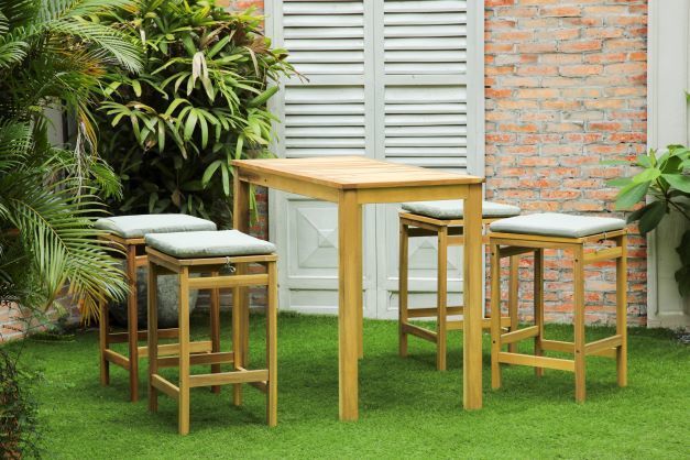Zestaw barowy mebli ogrodowych wykonany z drewna tropikalnego - akacji. Akacja jako drewno liściaste gwarantuje długą żywotność i jednocześnie łatwą konserwację. W skład zestawu wchodzi podnoszony stół oraz 4 hokery z poduszkami o grubości 4 cm. Stwórz kącik barowy, gdzie tylko chcesz.