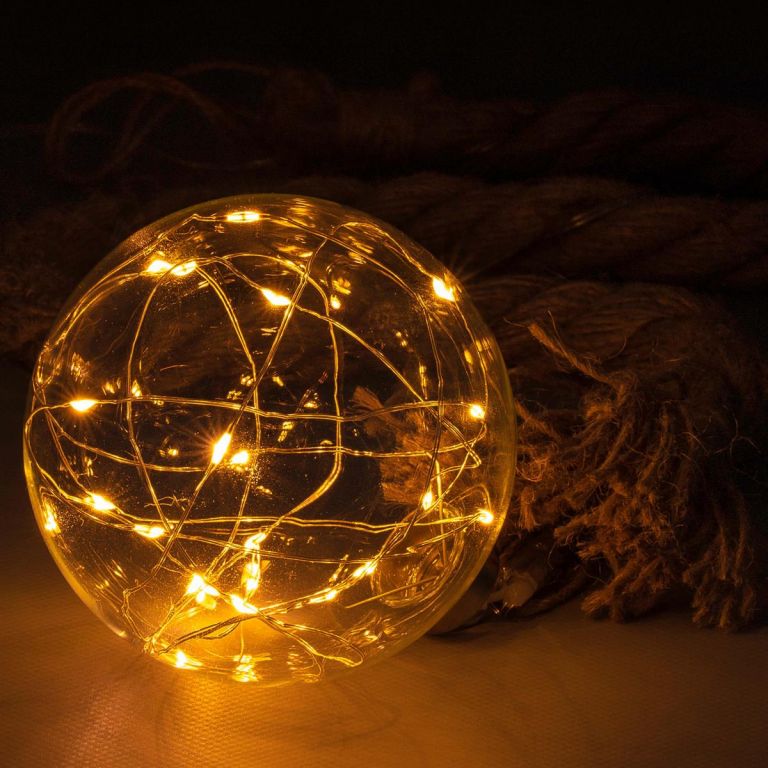 Piękna kula świetlna LED o średnicy 10 cm na linie do zawieszenia z błyszczącymi akcentami, to idealne oświetlenie na mroźne zimowe dni.