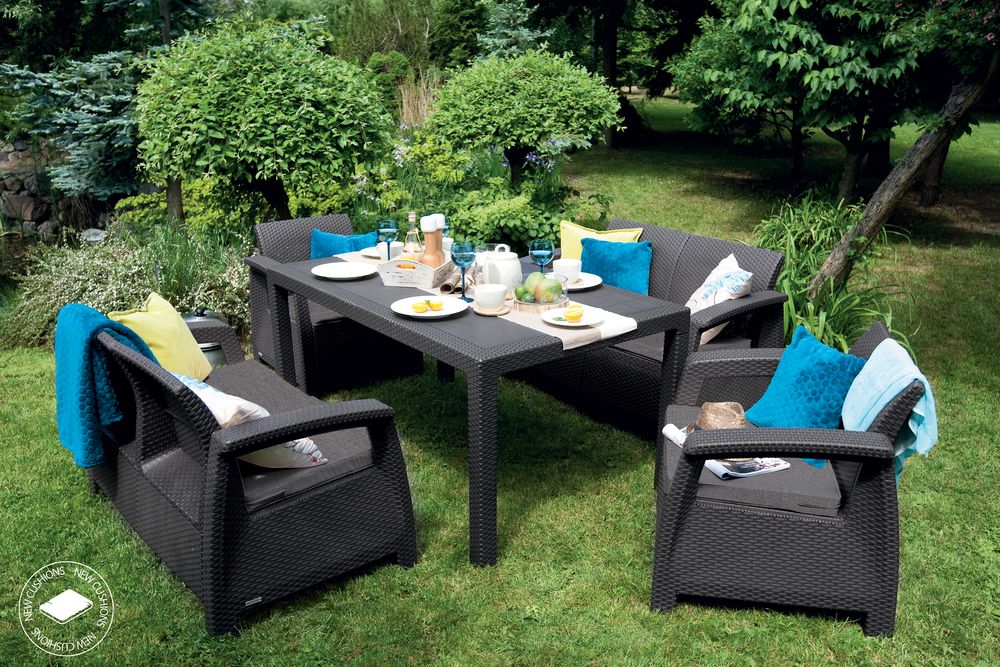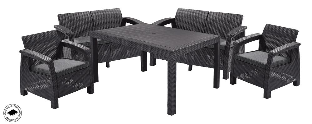 Zestaw mebli CORFU FIESTA antracyt zawiera: dwa fotele, dwie dwuosobowe sofy, stolik kawowy oraz szare poduszki. Całość wykonana została z najwyższej jakości polipropylenu o strukturze naturalnego rattanu. Zastosowanie tworzyw sztucznych pozwoliło uzyskać najlepszą odporność na warunki atmosferyczne i promieniowanie UV. Zestaw jest wyjątkowo trwały i może być pozostawiony na zewnątrz przez cały rok, ale może być używany i wewnątrz. Łatwy montaż i utrzymanie.