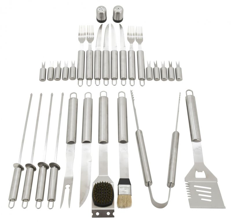 Zestaw zawiera wszystkie narzędzia do przygotowywania i spożywania różnorodnych potraw, a także późniejszą konserwację grilla. Ponadto wszystkie narzędzia wykonane są ze stali nierdzewnej.