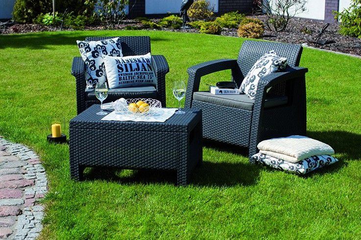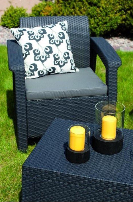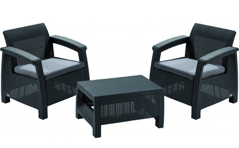 Zestaw WEEKEND firmy Corfu to mniej nowoczesna część wypoczynkowa zarówno na zewnątrz, jak i wewnątrz. Zestaw wykonany jest z tłoczonego tworzywa sztucznego imitującego rattan. Uzupełnieniem zestawu są poduszki, które zapewniają jeszcze większy komfort. To bardzo popularny zestaw. Składa się z dwóch krzeseł i stołu. Łatwa instalacja i konserwacja. Zestaw antracytowy, płaskie poduszki ze sztucznego rattanu (szare) są dołączone.