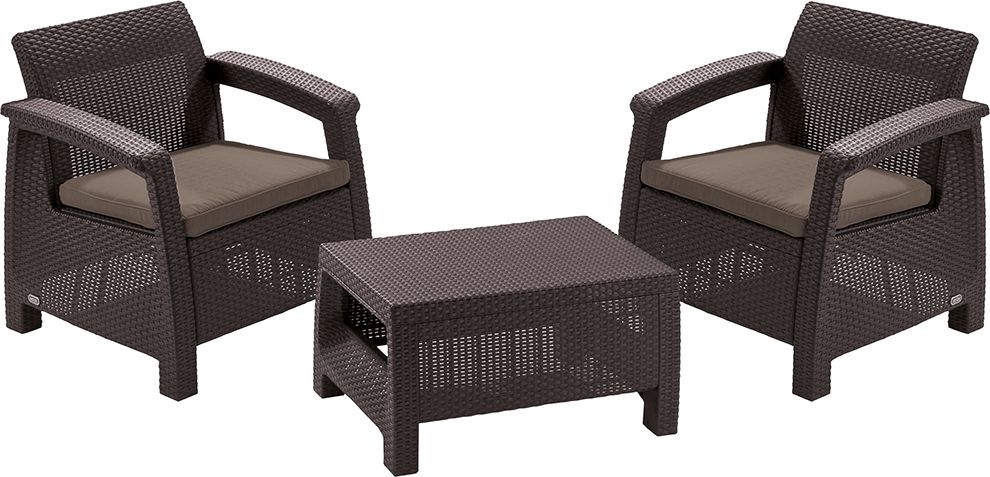 Zestaw Corfu WEEKEND to mniejsze, nowoczesne siedzisko do ogrodu, tarasu lub wnętrza. Zestaw wykonany z formowanego tworzywa sztucznego w imitacji płaskiego rattanu. Całość uzupełniają poduszki, które zapewniają jeszcze większy komfort. To bardzo popularny zestaw. Składa się z dwóch foteli i stolika. Łatwa instalacja i konserwacja. komplet brązowe, płaskie poduszki ze sztucznego rattanu (szaro-brązowe) są częścią kompletu producent: Allibert